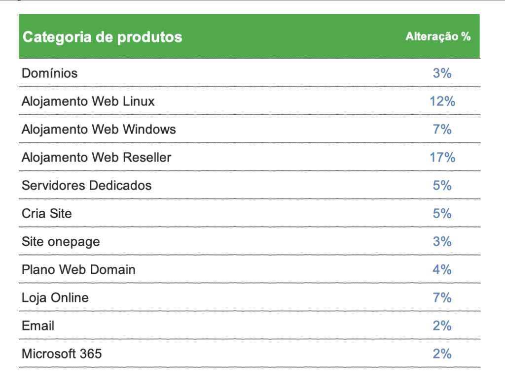- Domínios e Hosting: As taxas de fornecedores de domínios subiram entre 7% e 10%, enquanto os custos das plataformas de hosting aumentaram entre 10% e 30%.