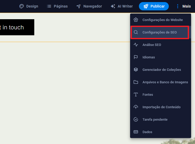 5) De seguida deve clicar na opção “Configurações de SEO”.