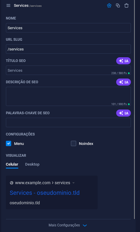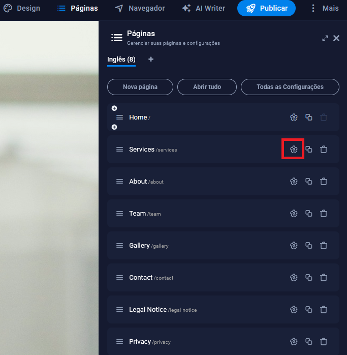 8) No Sitejet pode ainda editar os URLs das páginas para torna-los mais relevantes para o conteúdo e adicionar informação para o SEO de cada página.