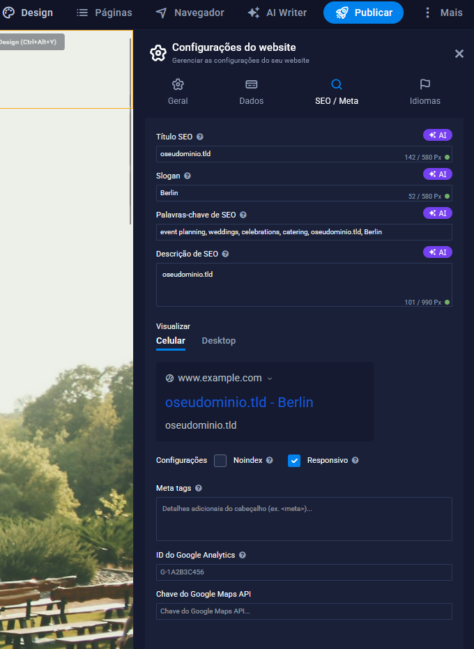 7) Deve completar estas informações – título da página e meta descrição. Estas informações ajudam a melhorar a visibilidade do seu site nas páginas dos resultados de pesquisa.