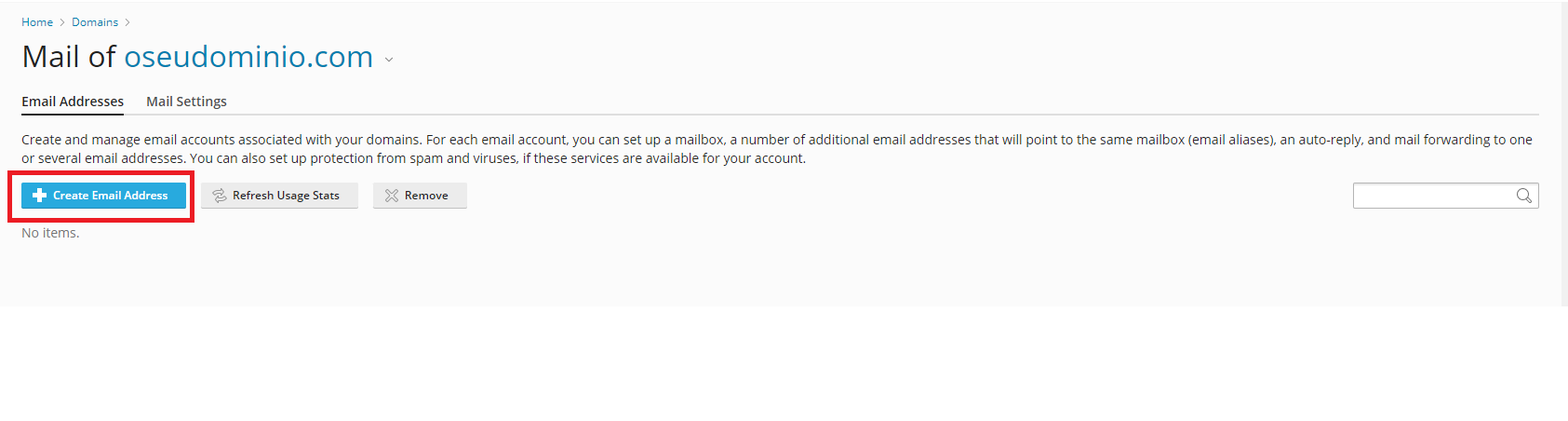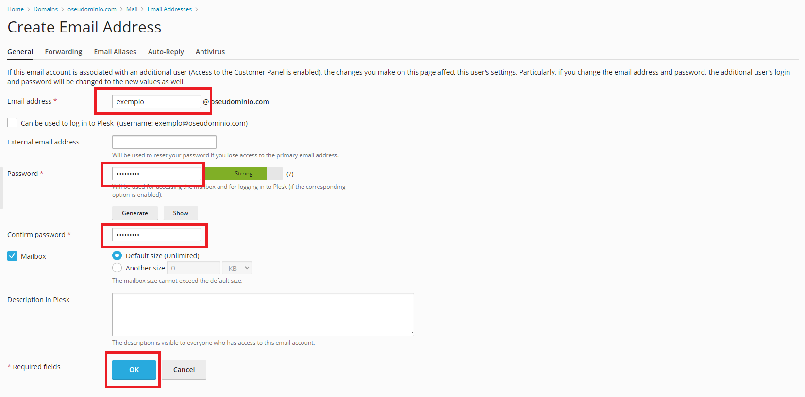 7) Preencha os campos ‘E-mail address’, ‘Password’ e ‘Confirm Password’ e clique em ‘OK’ para finalizar a criação da conta de email.
