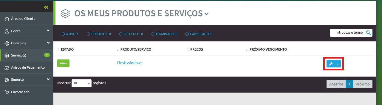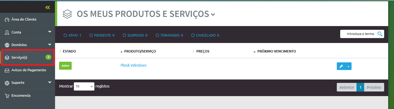 1) Efectue o login na área de clientes em https://my.dominios.pt e aceda à opção ‘Serviços‘.
