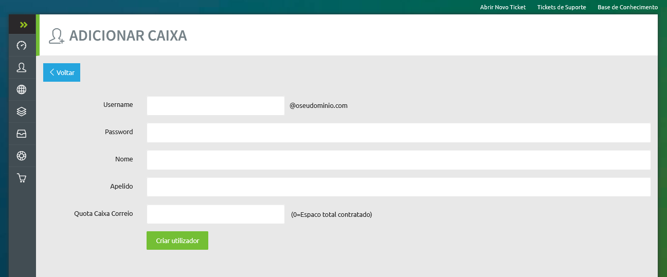 - Quota Caixa de Correio: Deve manter este valor em branco. Se colocar um número deve considerar que este é definido em MB (1024 para ter 1GB por exemplo)