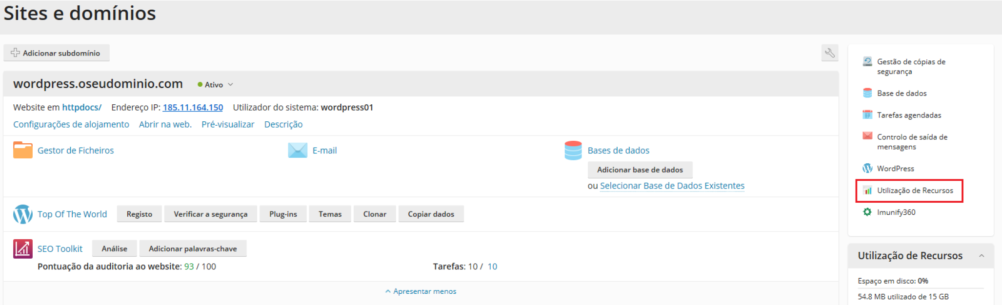 Os três planos existentes no serviço de Alojamento Web WordPress estão limitados em diversos recursos, como a utilização de CPU, memória, velocidade no disco, e processos. No painel de controlo do alojamento terá disponível o menu Utilização de recursos, onde poderá verificar o consumo de recursos do seu alojamento, e no caso de atingir um limite será apresentada uma mensagem com o recurso que atingiu o limite, assim como diversos gráficos: